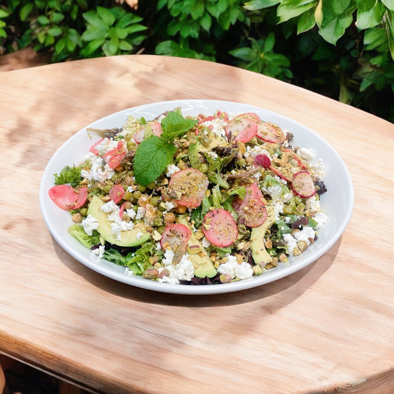 (our bright Spring salad with asparagus, peas, radishes, feta, roasted chickpeas, toasted seeds, avo, salad greens + pickled red onions with a bright herb flecked dressing being a fave!)