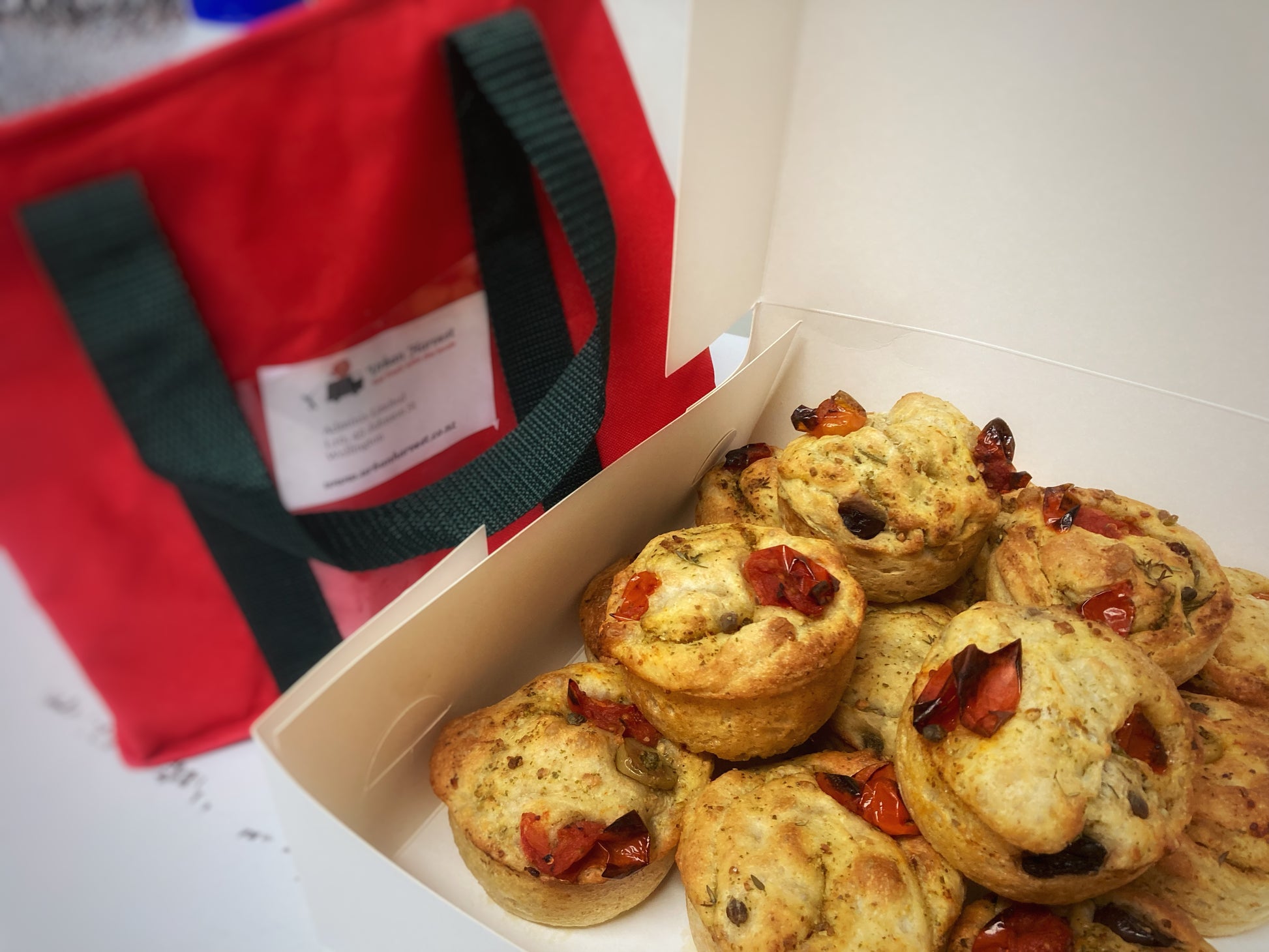 Savoury scrolls with either olives, pesto, capers & roasted tomatoes or peppers or with bacon & cheese for the meatlovers out there. Please specify in the delivery instructions whether you want meat or vegan.